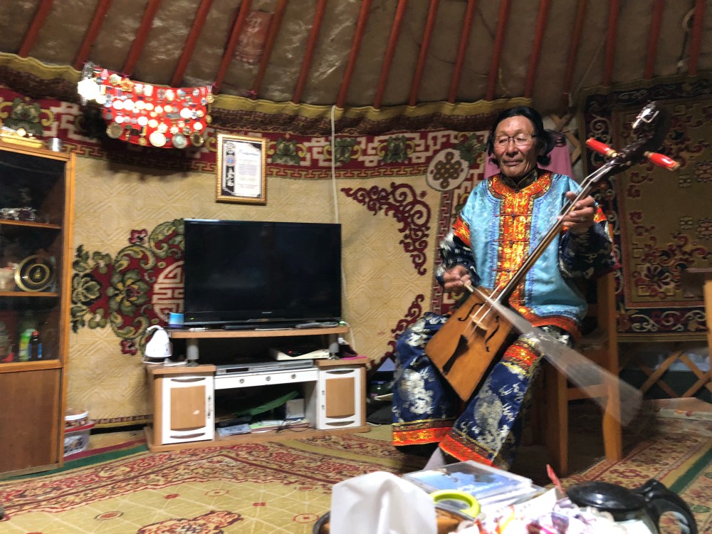S’en est suivi un spectacle de musique traditionnelle où l’homme de la maison se trouve à être une vedette de musique! Je te le jure! Il est le plus grand joueur de morin khuur, un instrument à cordes s’apparentant à un petit violoncelle. C’est un champion en Mongolie.