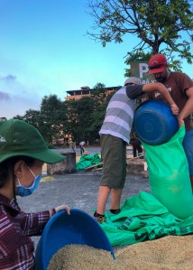 Les plants seront ensuite battus à la main ou à l’aide de machinerie pour en extraire les grains. Ces derniers devront être séchés à nouveau afin de faciliter l’extraction de l’enveloppe du riz (si on la conserve cela produit le riz brun) afin de produire le riz blanc.